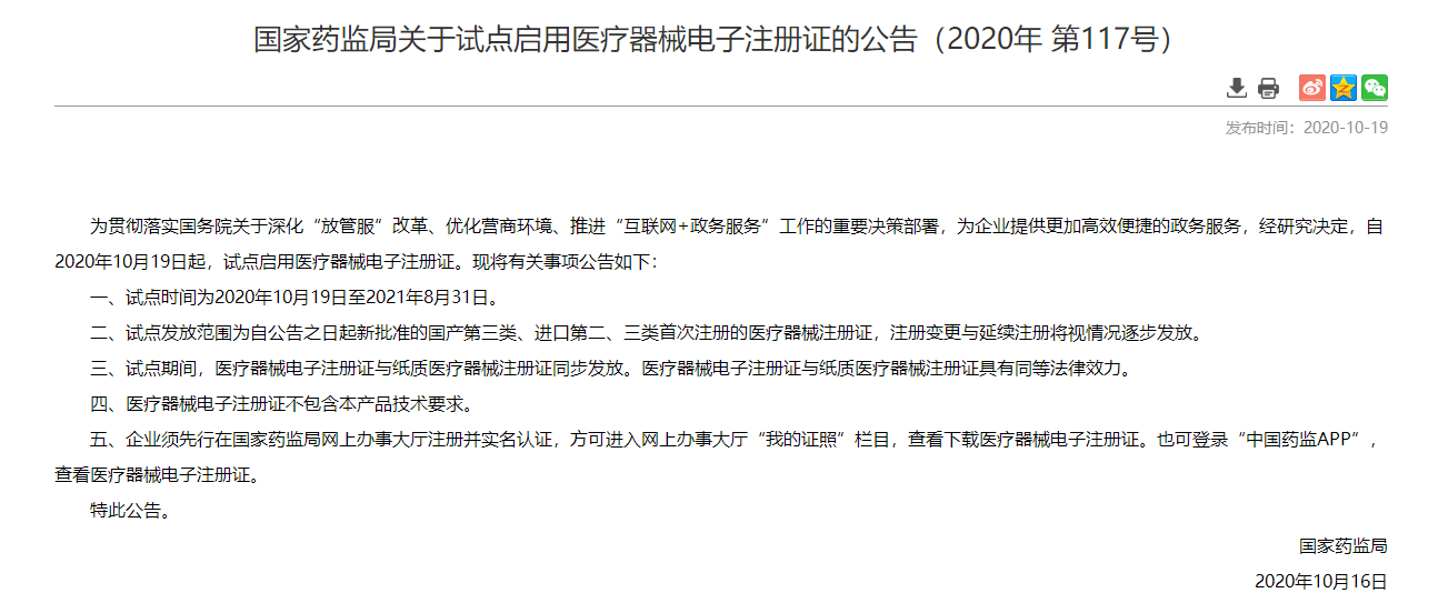 2020年10月19日,国家药品监督管理局发布《关于试点启用医疗器械电子注册证的公告》(2020年 第117号),旨在贯彻落实国务院关于深化“放管服”改革、优化营商环境、推进“互联网+政务服务”工作的重要决策部署,为企业提供更加高效便捷的政务服务。原文如下: