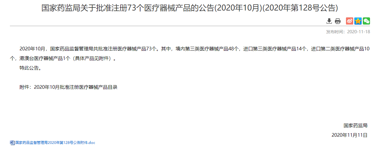 2020年11月18日,国家药品监督管理局公示《关于批准注册73个医疗器械产品的公告(2020年10月)》(2020年第128号公告)。原文如下:
