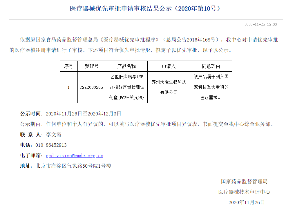2020年11月26日,国家药品监督管理局医疗器械技术审评中心公示《医疗器械优先审批申请审核结果》(2020年第10号)。原文如下: