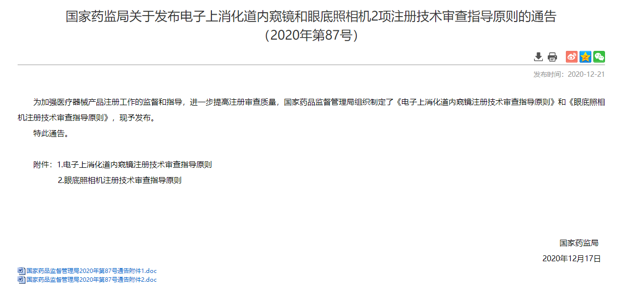 2020年12月17日,国家药品监督管理局发布《关于发布电子上消化道内窥镜和眼底照相机2项注册技术审查指导原则的通告》(2020年第87号),旨在加强医疗器械产品注册工作的监督和指导,进一步提高注册审查质量。原文如下: