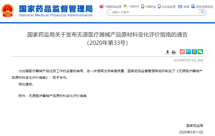 5月19日,国家药监局发布了《无源医疗器械产品原材料变化评价指南》(以下简称《指南》)(2020年第33号通告),旨在给出系统的、具有指导意义的无源医疗器械产品原材料变化进行风险分析的指南性文件,用于指导注册人规范相关产品的设计开发、注册申报及质量控制,同时也用于指导监管部门对相关无源医疗器械原材料变化引起的注册申请的技术审评。