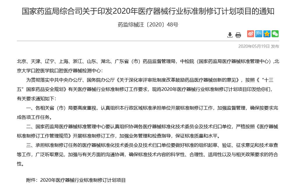 5月19日,国家药监局发布了《2020年医疗器械行业标准制修订计划项目的通知》(药监综械注〔2020〕48号)。