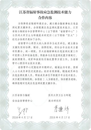 2018年4月17日,苏州大学卫生与环境技术研究所与江苏省核与辐射安全监督管理中心在南京签订合作协议,双方将就辐射事故应对系列工作开展合作。我所李建祥教授、刘犁老师出席了签约仪式。协议签订后,江苏省核与辐射安全监督管理中心将我所作为六家成员单位之一纳入江苏省辐射事故应急监测处置技术支援体系,共同保障江苏省辐射应急与环境安全。