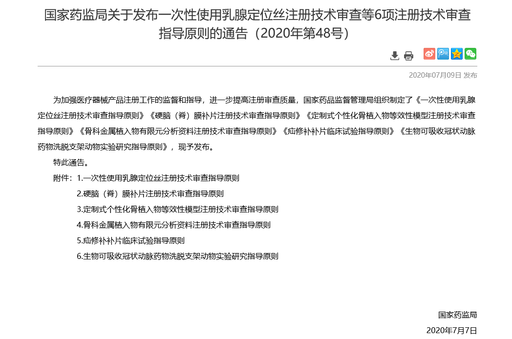 2020年07月09日,国家药品监督管理局发布通告:一次性使用乳腺定位丝注册技术审查等6项注册技术审查指导原则(2020年第48号)。旨在加强医疗器械产品注册工作的监督和指导,进一步提高注册审查质量。小编已为您搬来原文,快来先睹为快: