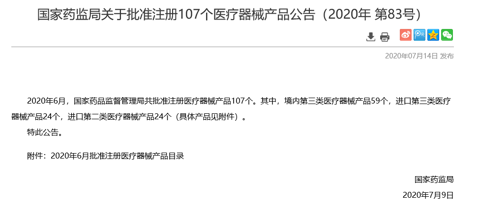 2020年7月14日国家药品监督管理局发布《关于批准注册107个医疗器械产品公告》(2020年 第83号),原文如下: