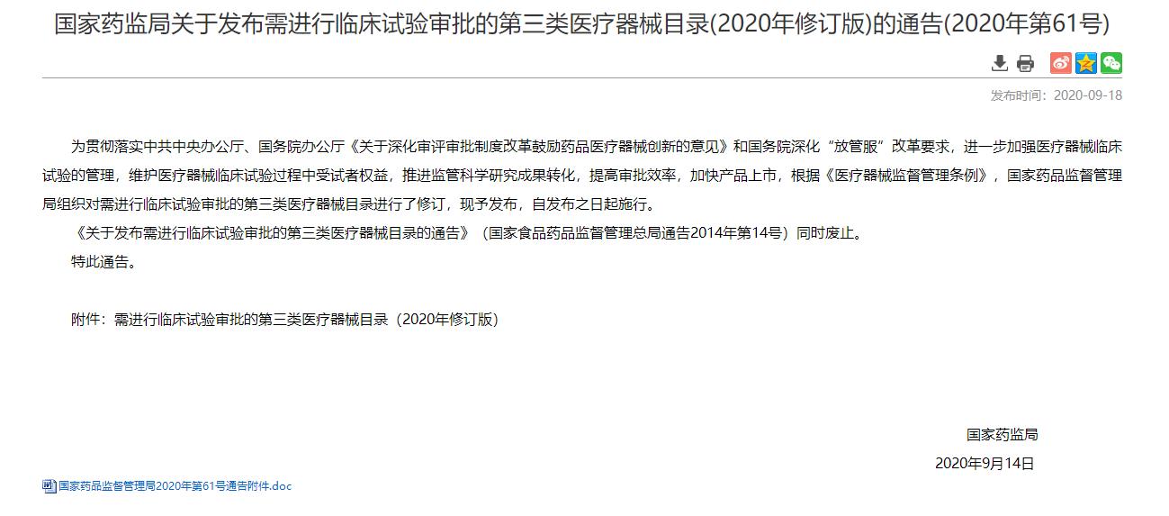 2020年09月18日,国家药品监督管理局发布《需进行临床试验审批的第三类医疗器械目录(2020年修订版)的通告》(2020年第61号),原文如下: