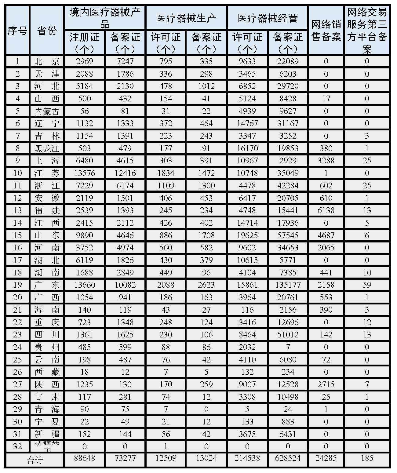 国家药监局汇总了各省有效期内医疗器械产品注册备案、医疗器械生产企业许可备案、医疗器械经营企业许可备案、医疗器械网络销售备案、医疗器械网络交易服务第三方平台备案信息(见下方表格),现按月公布。具体数据可点击国家药监局数据查询页面医疗器械模块查询(http://app1.nmpa.gov.cn/data_nmpa/face3/dir.html?type=ylqx)。如对数据有疑问,请按网站数据库公布的纠错维护方式操作。