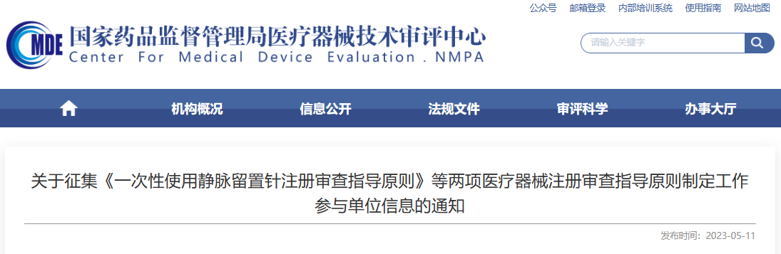 参考资料:关于征集《一次性使用静脉留置针注册审查指导原则》等两项医疗器械注册审查指导原则制定工作参与单位信息的通知 (cmde.org.cn)