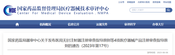 参考网址:国家药监局器审中心关于发布医用无针注射器注册审查指导原则等4项医疗器械产品注册审查指导原则的通告(2023年第17号) (cmde.org.cn)