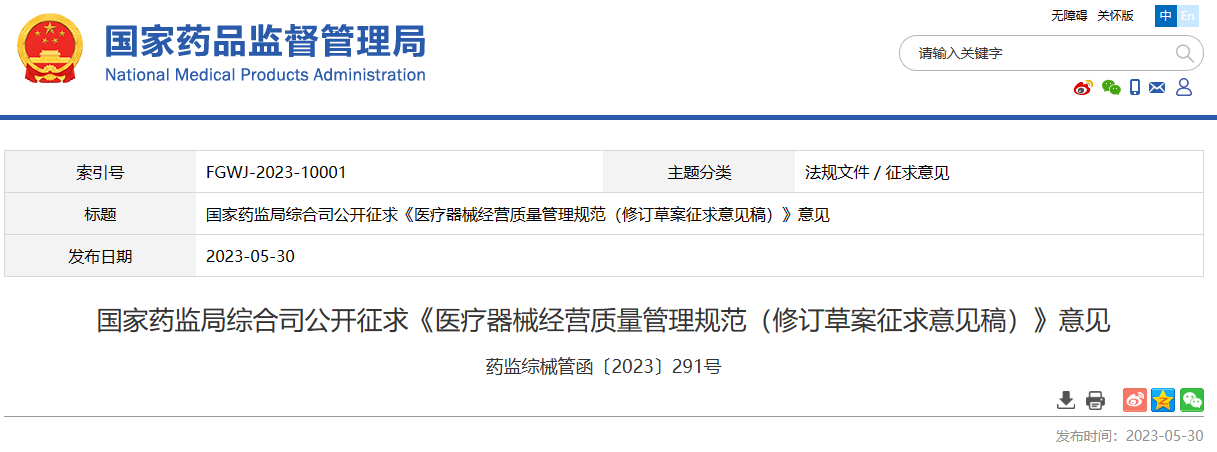 转载来源:国家药监局综合司公开征求《医疗器械经营质量管理规范(修订草案征求意见稿)》意见 (nmpa.gov.cn)