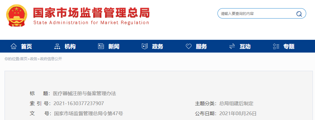 8月31日,国家市场监督管理总局发布《医疗器械注册与备案管理办法》(以下简称《办法》),自2021年10月1日起施行。