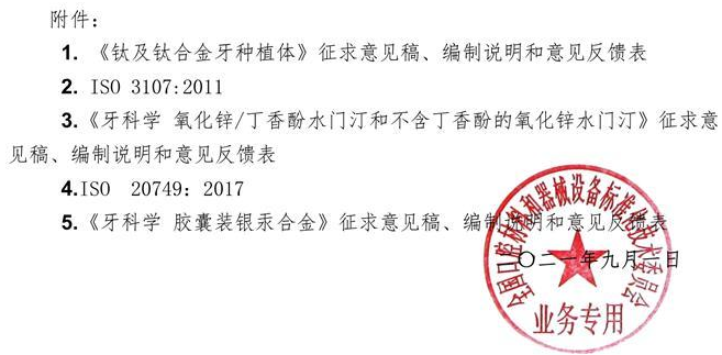 目编号的函》(国械标管函【2021】204号),由北京大学口腔医学院口腔医疗器械检验中心负责起草的《钛及钛合金牙种植体》等三项标准的征求意见稿业已完成。现将标准征求意见稿附上,请进行审查、提出修改意见。标准列表如下: