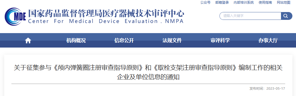 参考资料:关于征集参与《颅内弹簧圈注册审查指导原则》和《取栓支架注册审查指导原则》编制工作的相关企业及单位信息的通知 (cmde.org.cn)