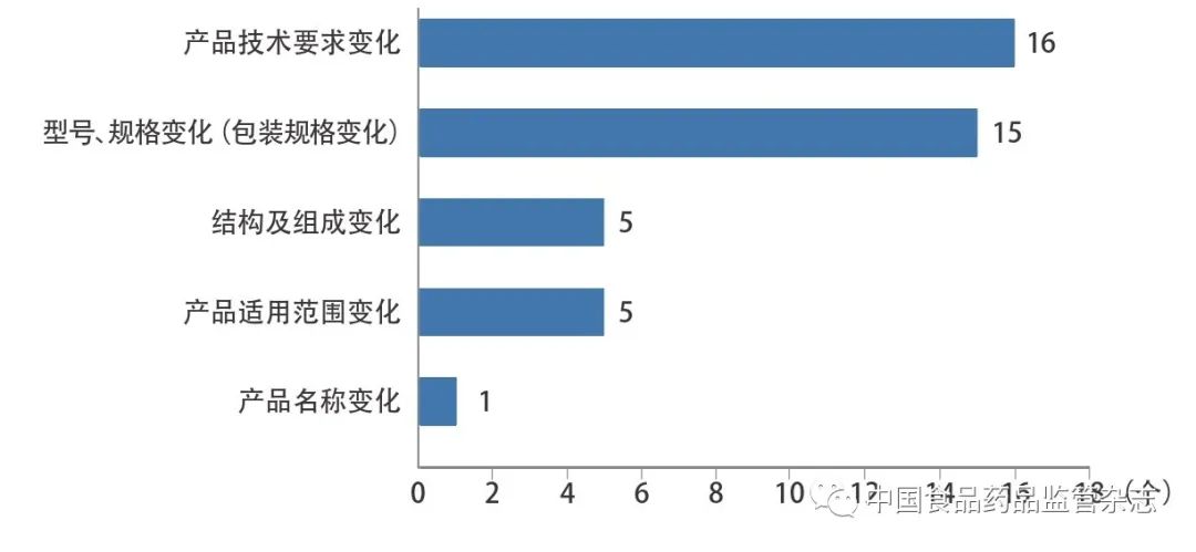 变更注册的技术咨询类问题主要集中在产品技术要求变化和型号、规格变化(包装规格变化)。其中产品技术要求变化问题(16个)主要包括变更注册过程中是否能够提供自检报告;产品因增加型号、规格引起产品技术要求变化和如何选取典型产品注册送检;产品贯彻新实施的国家标准和行业标准引起产品技术要求变化;产品性能升级引起产品技术要求变化等。型号、规格变化(包装规格变化)问题(15个)主要集中在不引起产品技术要求变化是否需要进行检验。其他问题(11个)包括产品结构及组成未发生实质性变化,如原材料供应商发生变化是否需要申请变更注册;产品适用范围未发生实质性变化是否需要开展临床评价;变更产品适用范围是否可以通过已上市同品种医疗器械比对途径开展临床评价等。