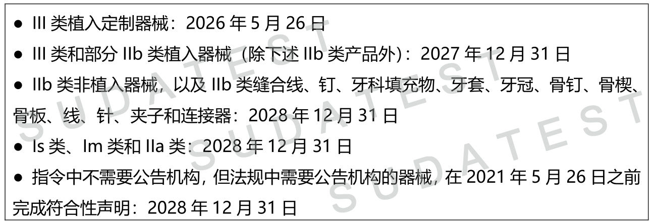 MDR 附录I中规定的相关通用安全和性能要求以及本法规中规定的通用规范,并且根据MDR Article 52规定有公告机构参与产品的符合性评估,以及在满足以下条件后可在2028年6月22日2029年12月31日前投放市场或投入使用: