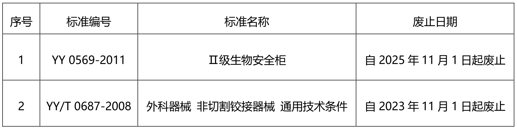 参考资料:国家药监局关于废止YY 0569-2011《Ⅱ级生物安全柜》和YY/T 0687-2008《外科器械 非切割铰接器械 通用技术条件》2项医疗器械行业标准的公告(2023年第135号) (nmpa.gov.cn)