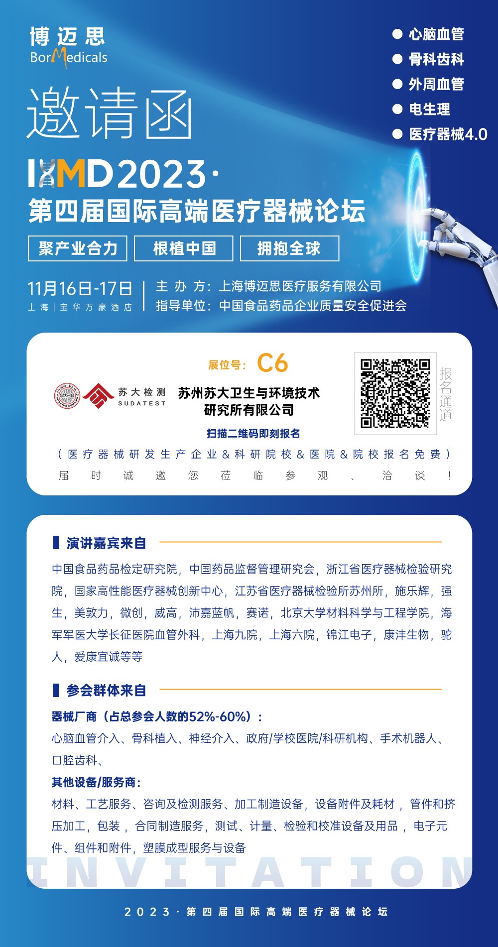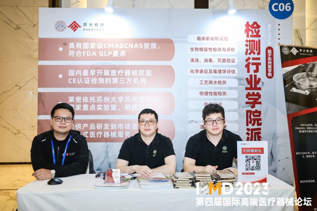 11月16日,2023IHMD第四届国际高端医疗器械论坛在沪隆重开幕。本届峰会以“聚产业合力,根植中国,拥抱全球”为主题,汇集了行业知名医疗器械大咖代表,话题涉及:心脑血管介入,骨科齿科植入,外周血管介入,电生理介入,医疗器械4.0等板块。作为拥有近40年行业经验的第三方技术服务机构,苏大检测本次在IHMD现场精彩亮相并设置展位(C6号)。
