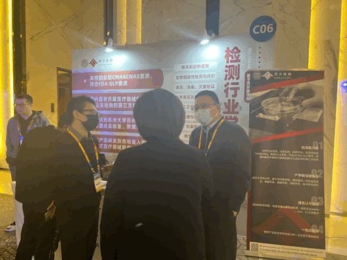 会议第一天,现场人头攒动,苏大检测展台人流如潮,吸引了众多观众驻足,工作人员为与会嘉宾带来医疗器械检测技术咨询及经验分享,有针对性的答疑及专业建议赢得大家的一致好评。
