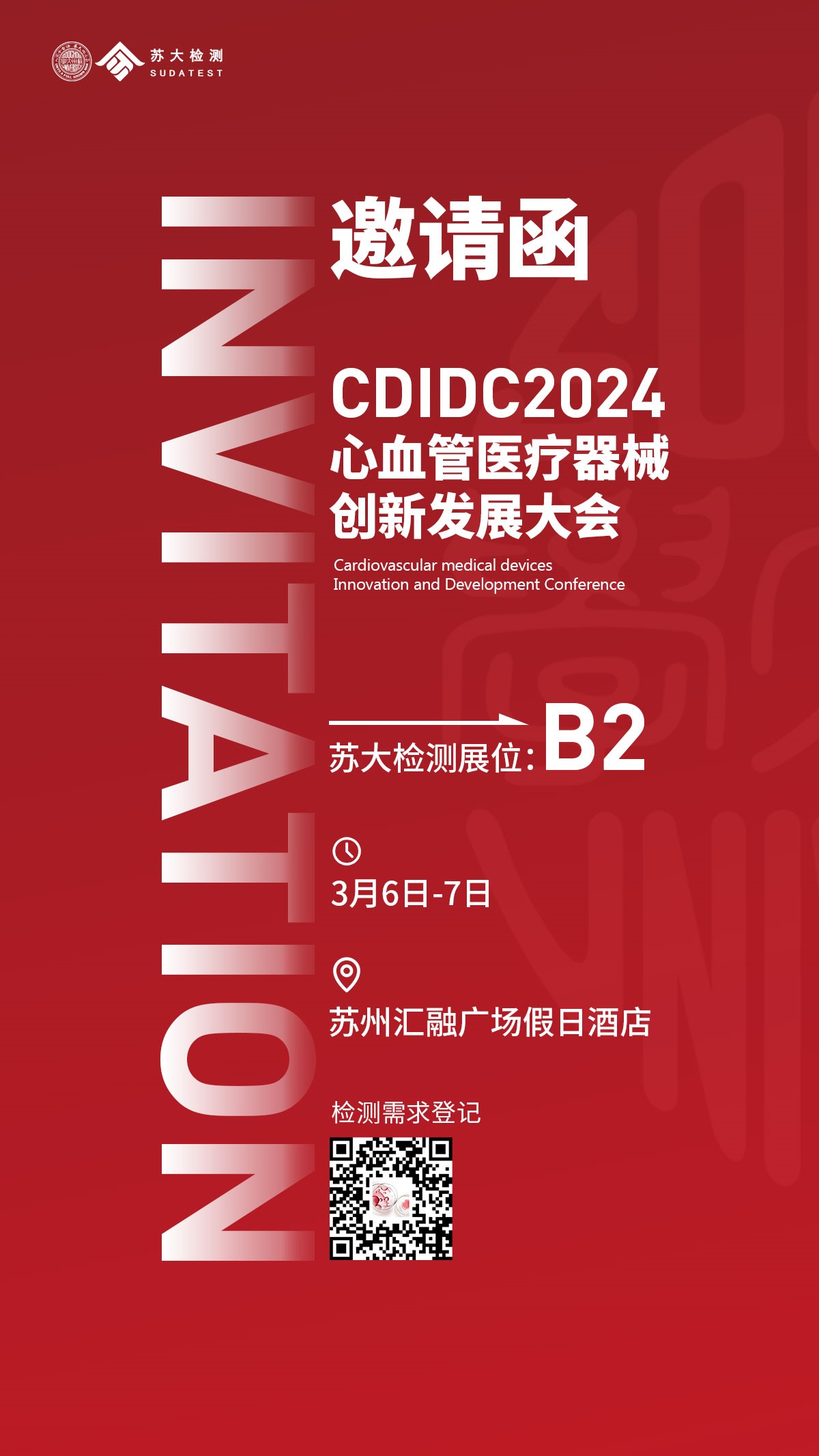 2024年3月6-7日,2024心血管医疗器械创新发展大会将在苏州召开,本次大会将汇聚一流创新要素和资源,搭建高质量产业交流服务平台,苏大检测全体同仁期待与您现场相约。