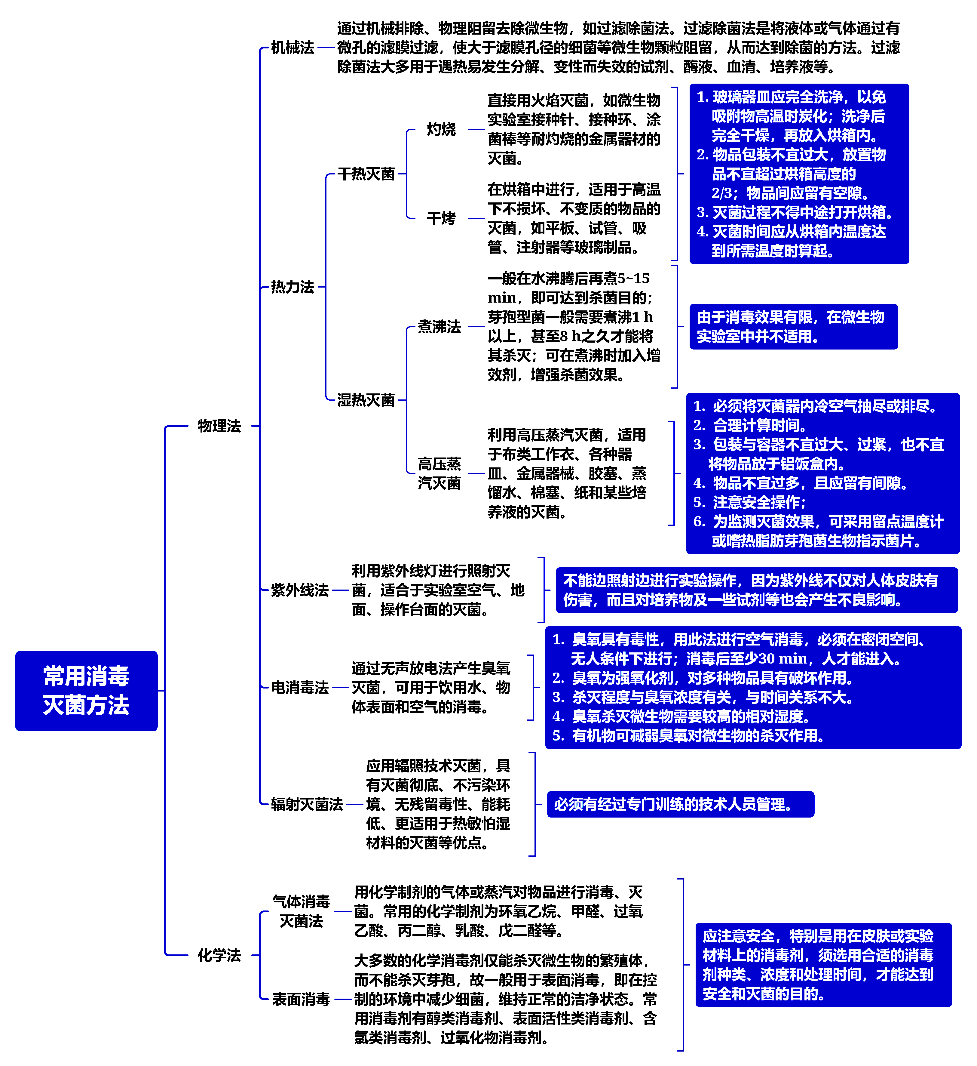 微生物实验室是进行微生物研究的重要场所,对环境要求极高,实验室内所用器具必要严格进行消毒灭菌处理,常用的器材一般包括玻璃器材、金属器械、橡胶制品及塑料制品等,每类器材的消毒及灭菌措施都有不同。目前,常用的消毒灭菌方法按其性质可分为两大类:1)物理法,如干热灭菌法、湿热灭菌法、过滤除菌法、射线杀菌法等;2)化学法,常用的化学消毒剂包括甲醛、高锰酸钾、70%-75%乙醇、过氧乙酸等。小编已将微生物实验室常用的消毒灭菌方法的要点和注意事项总结如下???,敬请查阅: