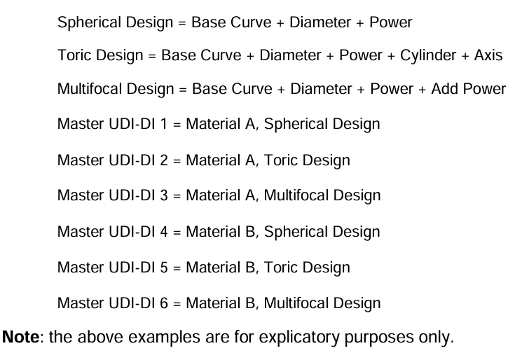 标准隐形眼镜的主UDI-DI将分配给制造商定义的特定隐形眼镜设计参数组合,至少包括基弧和直径,并辅以标签上向最终用户、眼科护理专业人员等指明的其他相关参数。示例:当一种镜片以一种材料提供,并有球面、复曲面、多焦点设计变体时,它将由三个基本UDI-DI(一种材料+设计类型)和相应数量的主UDI-DI覆盖,如下图: