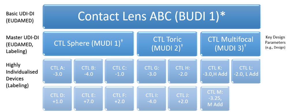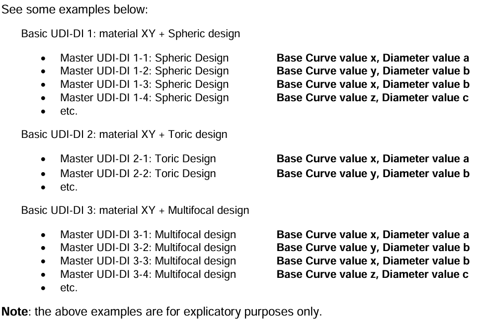 由于隐形眼镜具有众多临床参数特征,存在多种变体。若根据MDR要求,为每种隐形眼镜变体都分配独立的UDI-DI,则会在UDI-DI层面的个体化分配导致相似隐形眼镜的UDI-DI数量激增,不仅使Eudamed超负荷运行,也与隐形眼镜相关的安全风险程度不成比例。因此,欧盟医疗器械主管机构根据当前技术表明:将具有相同临床和设计参数组合的隐形眼镜归组到同一UDI-DI(主UDI-DI)下。以下为示例图:
